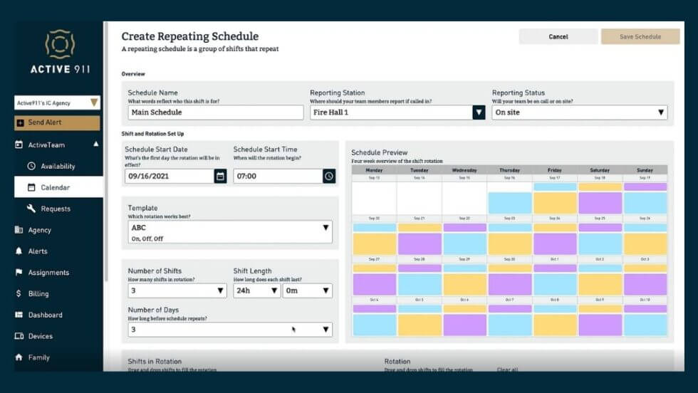 If you are an admin, when you login to the website, you will see the calendar view. This is where you can create repeating and non-repeating schedules. You can customize what station each schedule applies to, the reporting status, start date, times, and shift patterns. You can also use one of our pre-made rotations, such as a 24-on/48-off or make your own from scratch.